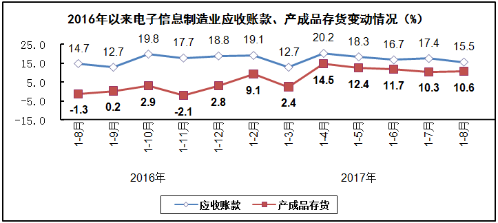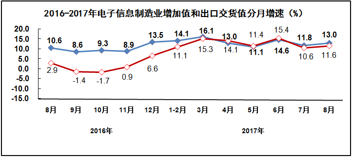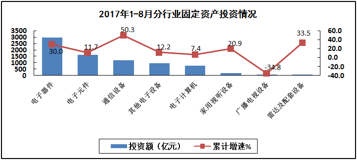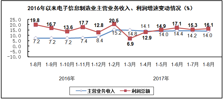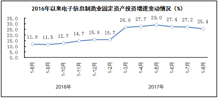 2017年1-8月,电子信息制造业发展势头良好,生产呈现快速增长态势,出口进入平稳增长区间,行业效益水平持续提升,固定资产投资保持高速增长。