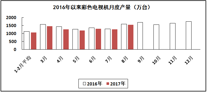 家用视听行业生产持续低迷,出口保持较快增长。1-8月,生产彩色电视机10253万台,同比下降5.2%,其中液晶电视机9618万台,同比下降7.8%;智能电视6361万台,同比下降2.1%,占彩电产量比重为62.0%。出口交货值同比增长12.9%,其中8月份增长11.7%。