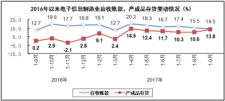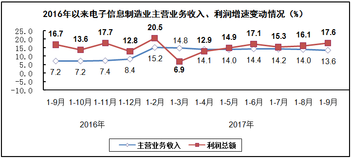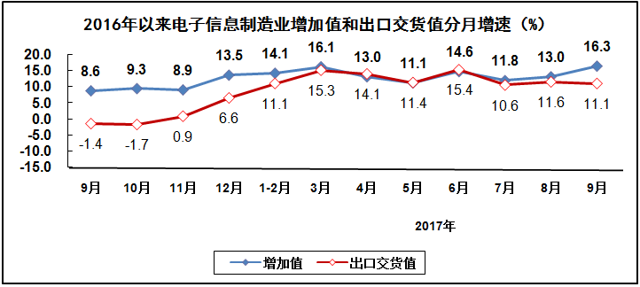 生产增速继续加快。前三季度,规模以上电子信息制造业增加值同比增长13.9%,同比加快4.2个百分点;快于全部规模以上工业增速7.2个百分点,占规模以上工业增加值比重为7.4%。其中,9月份增速为16.3%,比8月份加快3.3个百分点。