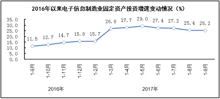 固定资产投资保持高速增长。前三季度,电子信息制造业500万元以上项目固定资产投资额同比增长25.2%,增速同比加快13.7个百分点。电子信息制造业本年新增固定资产同比增长41.6%。