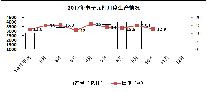 电子元件行业生产保持平稳增长,出口增速逐月走高。1-10月,生产电子元件35802亿只,同比增长18%。出口交货值同比增长16.0%,其中10月份增长22.0%。