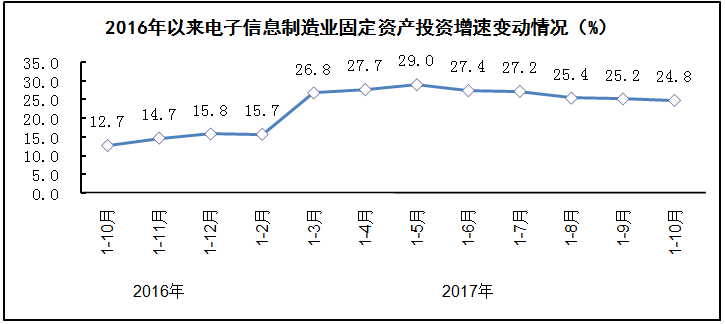 2017年1-10月,电子信息制造业延续稳中向好的发展态势,生产保持较快增长,出口形势明显好于去年同期,行业效益水平持续提升,固定资产投资保持高速增长。10月当月生产、出口增速比上月有所放缓。