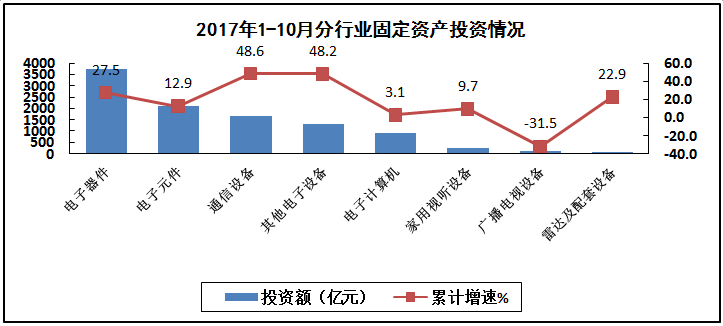 固定资产投资保持高速增长。1-10月,电子信息制造业500万元以上项目完成固定资产投资额同比增长24.8%,增速同比加快12.1个百分点。电子信息制造业本年新增固定资产同比增长38.1%。